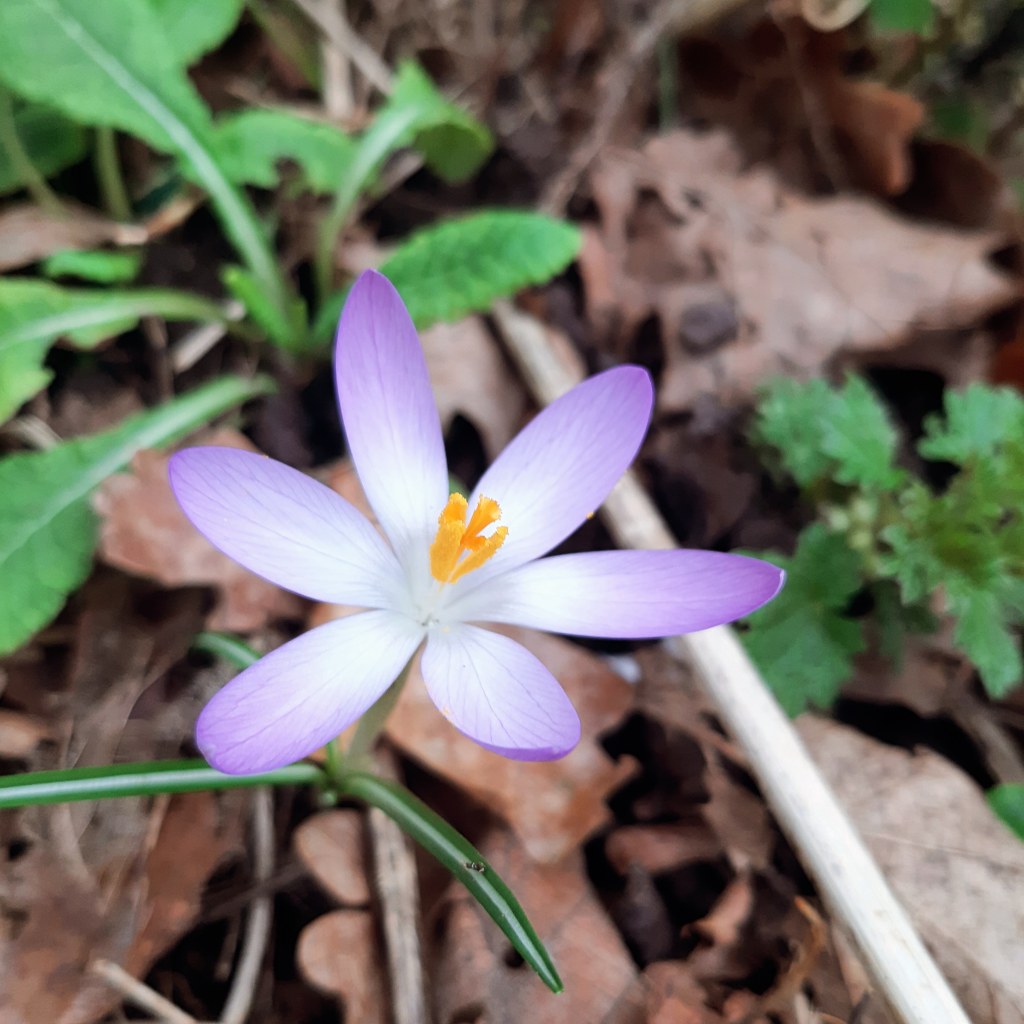 Further evidence of a change in season was offered by the beautiful flower of a woodland crocus emerging from the ground – its delicate violet and white petals, and orange stamen in colourful contrast to the brown leaves around it.